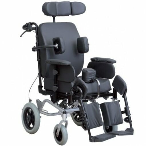 E’ dotata di poggiatesta regolabile, sostegni per il torace ed altre funzioni finalizzate ad aumentare il comfort e la stabilità del paziente. In particolare, viene usato Satin (resina di poliuretano e tessuto) ad alta densità per i rivestimenti allo scopo di proteggere il corpo del paziente, quando direttamente posto a sedere sulla carrozzina. L’intero rivestimento può essere rimosso per essere pulito.