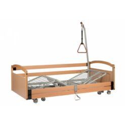 Sostegno per alzarsi dal letto compreso. Testiera, pediera e sponde in laminato di legno.